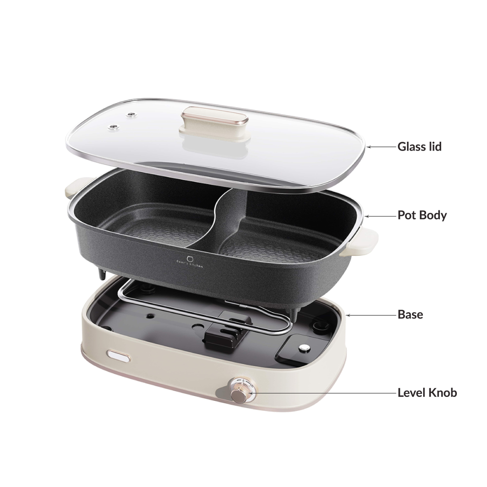 ⚙️ Inside Box: Base with Power Cord ×1, Dual-Compartment Pot ×1, Glass Lid ×1, Instruction Manual ×1