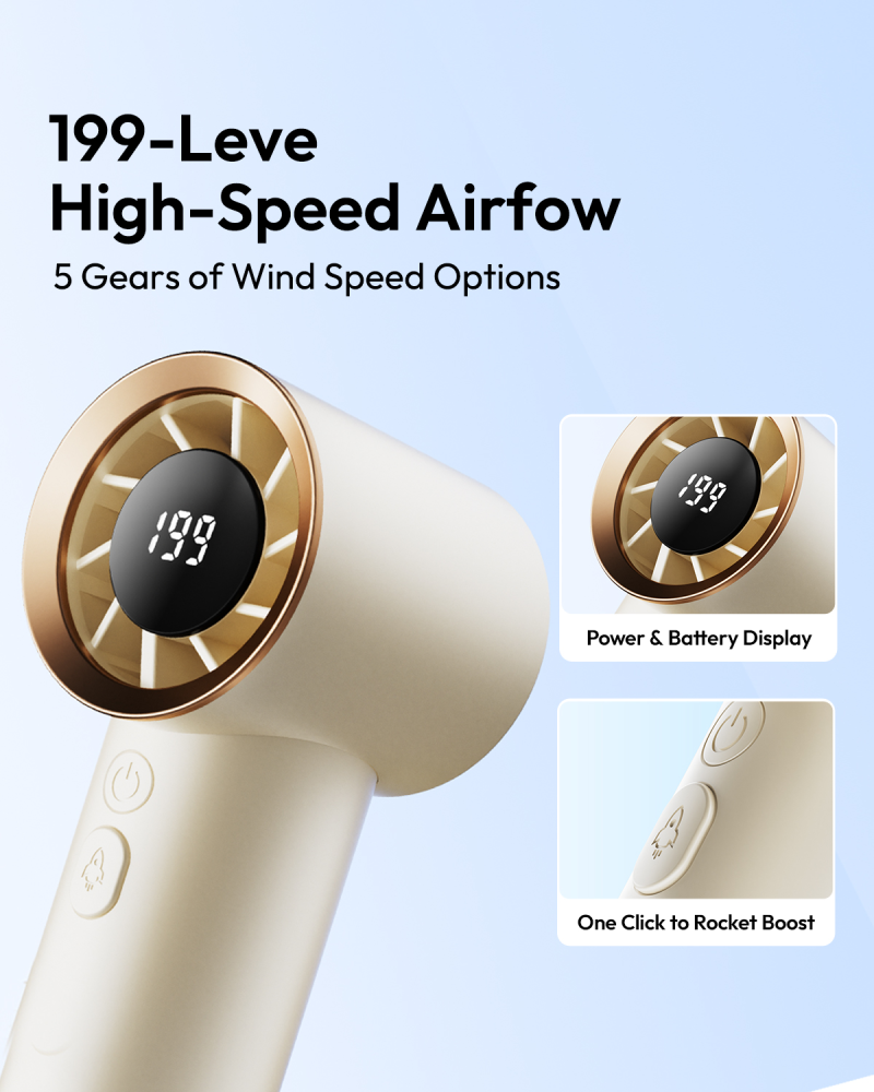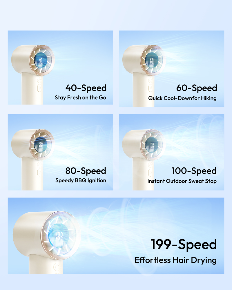 - 5 wind speed levels + long press for 199-level hurricane mode