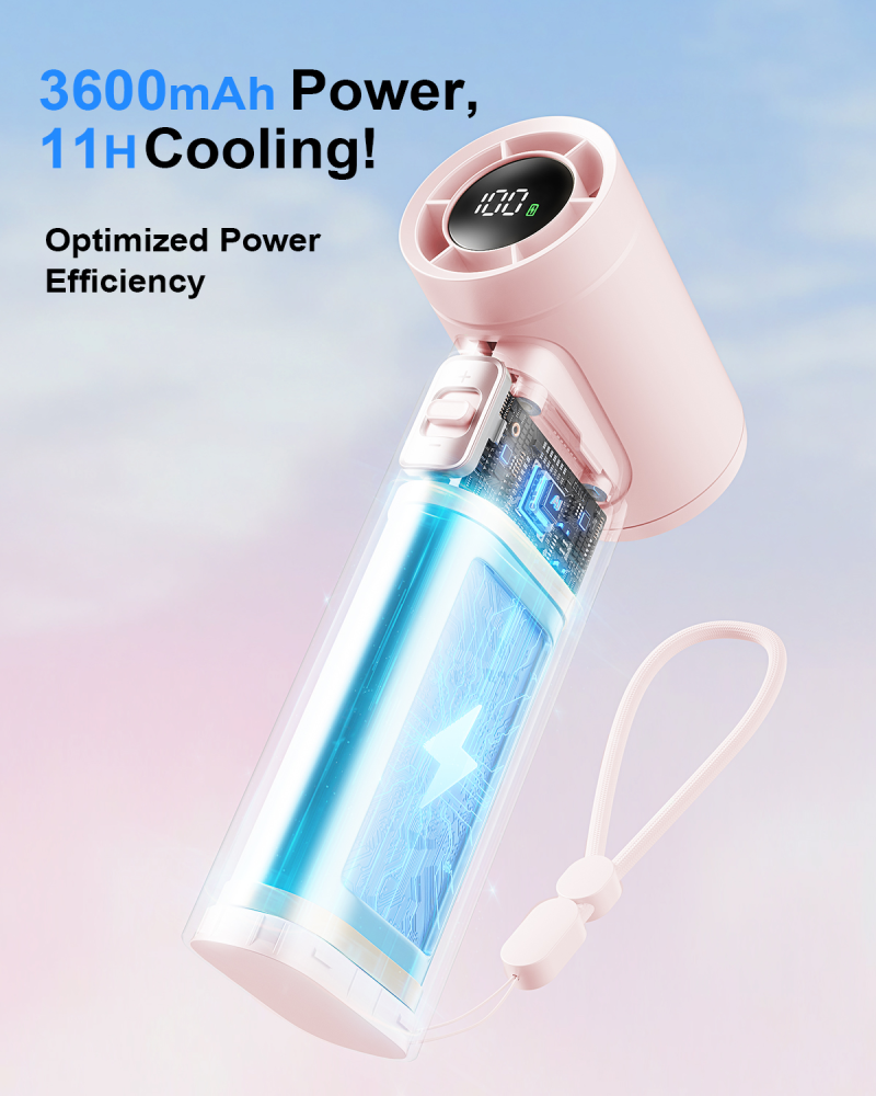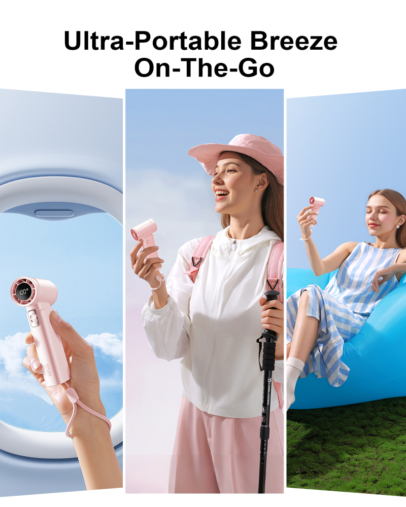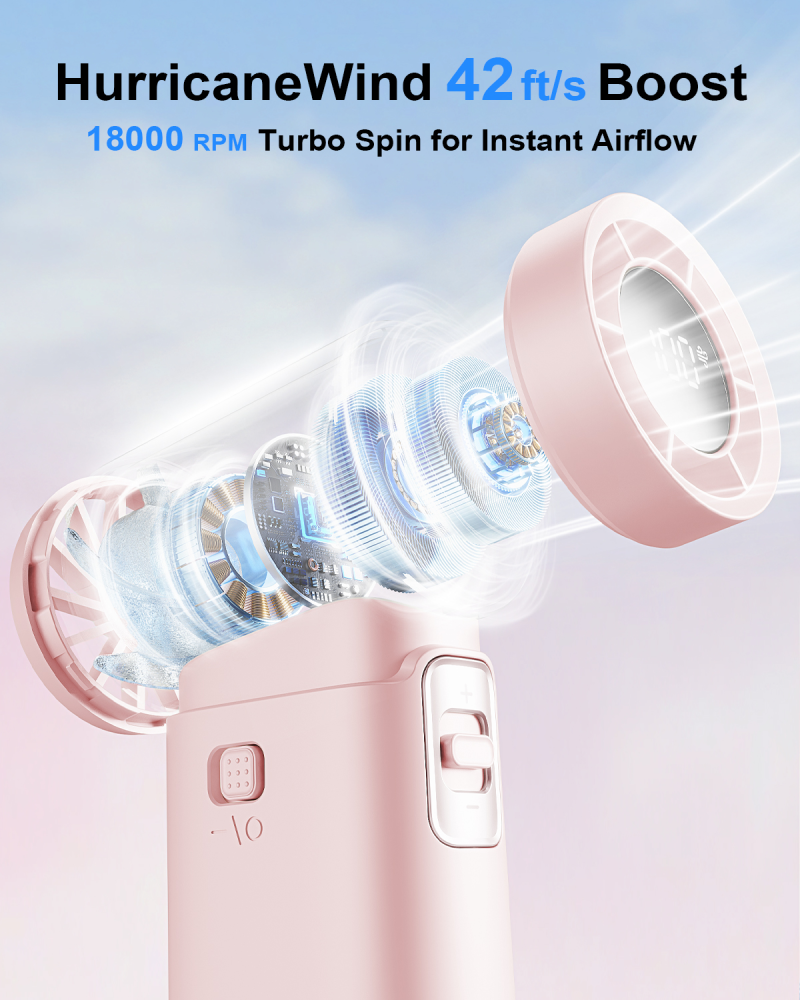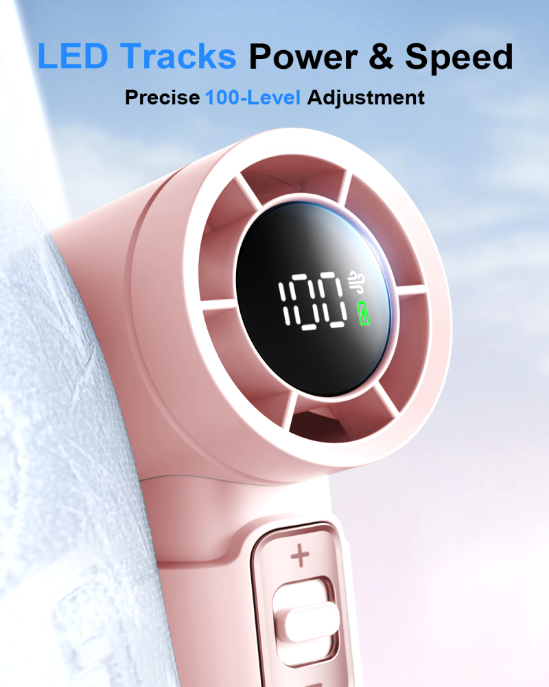 19,000 RPM handheld fan with 30° elevated outlet for direct face cooling. Features 100-level stepless speed control, LED display, built-in lanyard for hands-free use & up to 9 hours battery life. Compact, powerful & stylish.