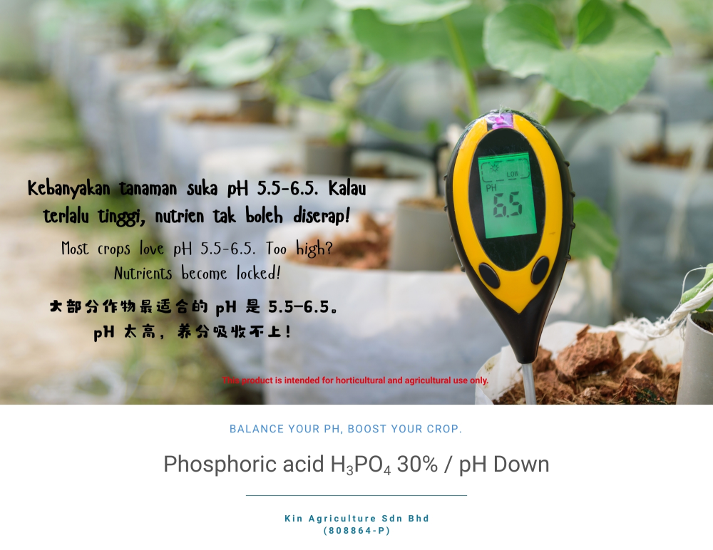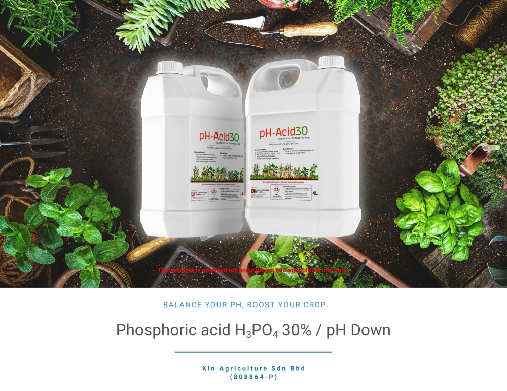Asid Fosforik 30% (H₃PO₄) digunakan untuk menurunkan pH air atau larutan nutrien bagi meningkatkan serapan baja dan keberkesanan sistem fertigasi.